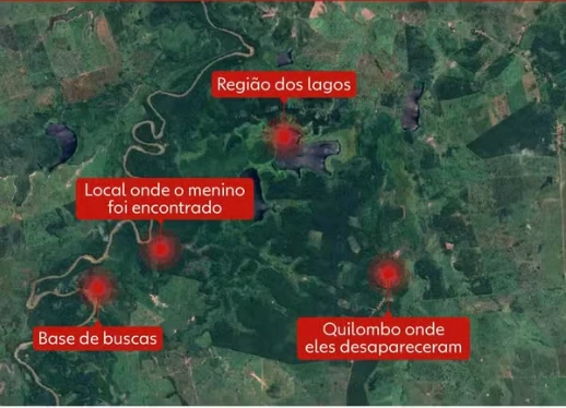 A área de buscas, que possui cerca de 15 km², fica entre o Quilombo de São Sebastião dos Pretos e o Povoado de Santa Rosa, onde o menino de 8 anos foi encontrado, a aproximadamente 4 km em linha reta do local do desaparecimento.