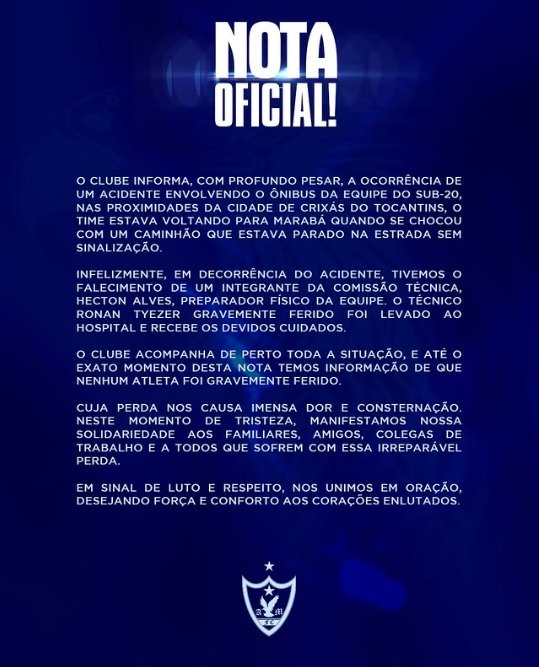 No documento, o time do Pará, que estava voltando para Marabá, afirmou que o acidente aconteceu após o ônibus se chocar com um caminhão que estava parado na estrada sem sinalização.
